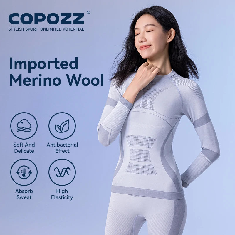 COPOZZ Female Male Merino Wool Ski Thermal Underwear Set Functional Compression Tracksuit Tight Snowboard Tops and Pants Adult